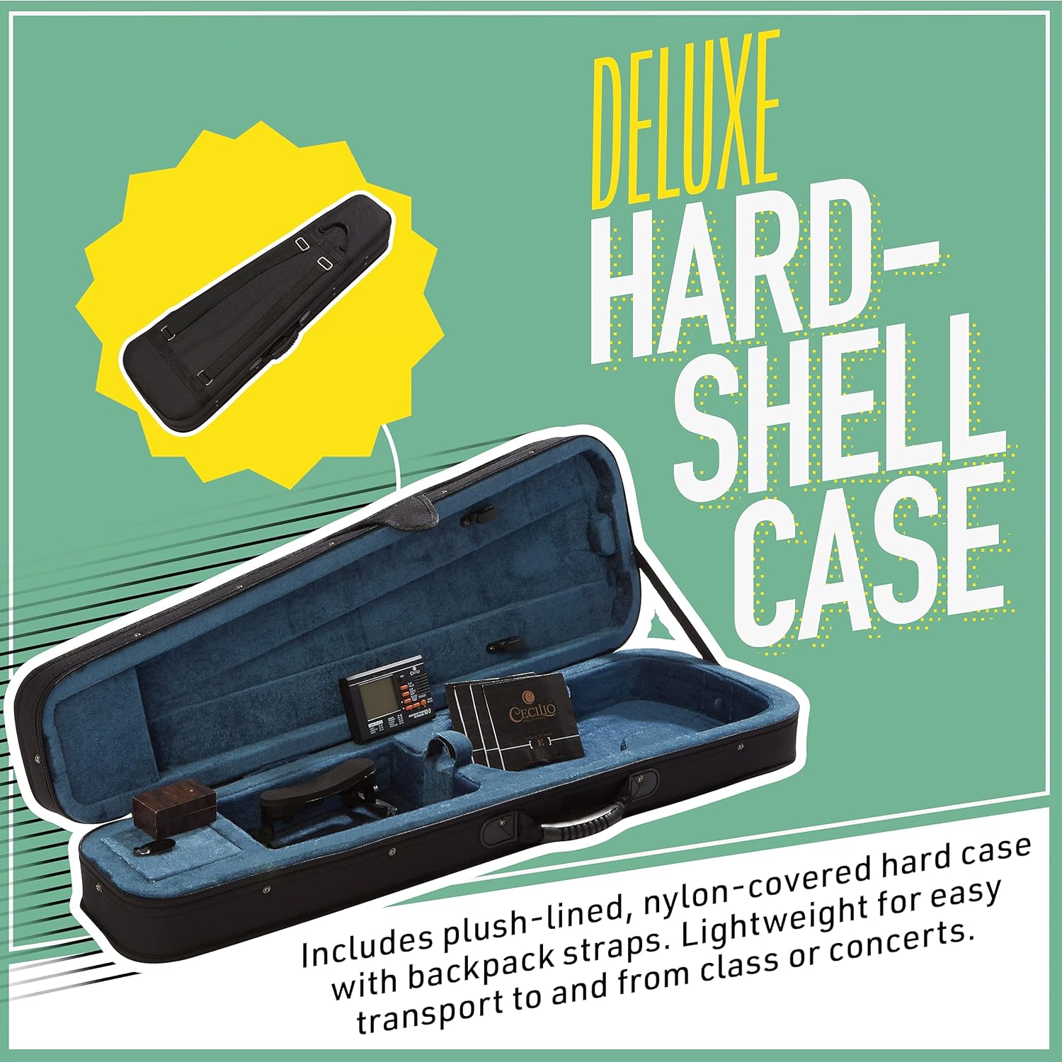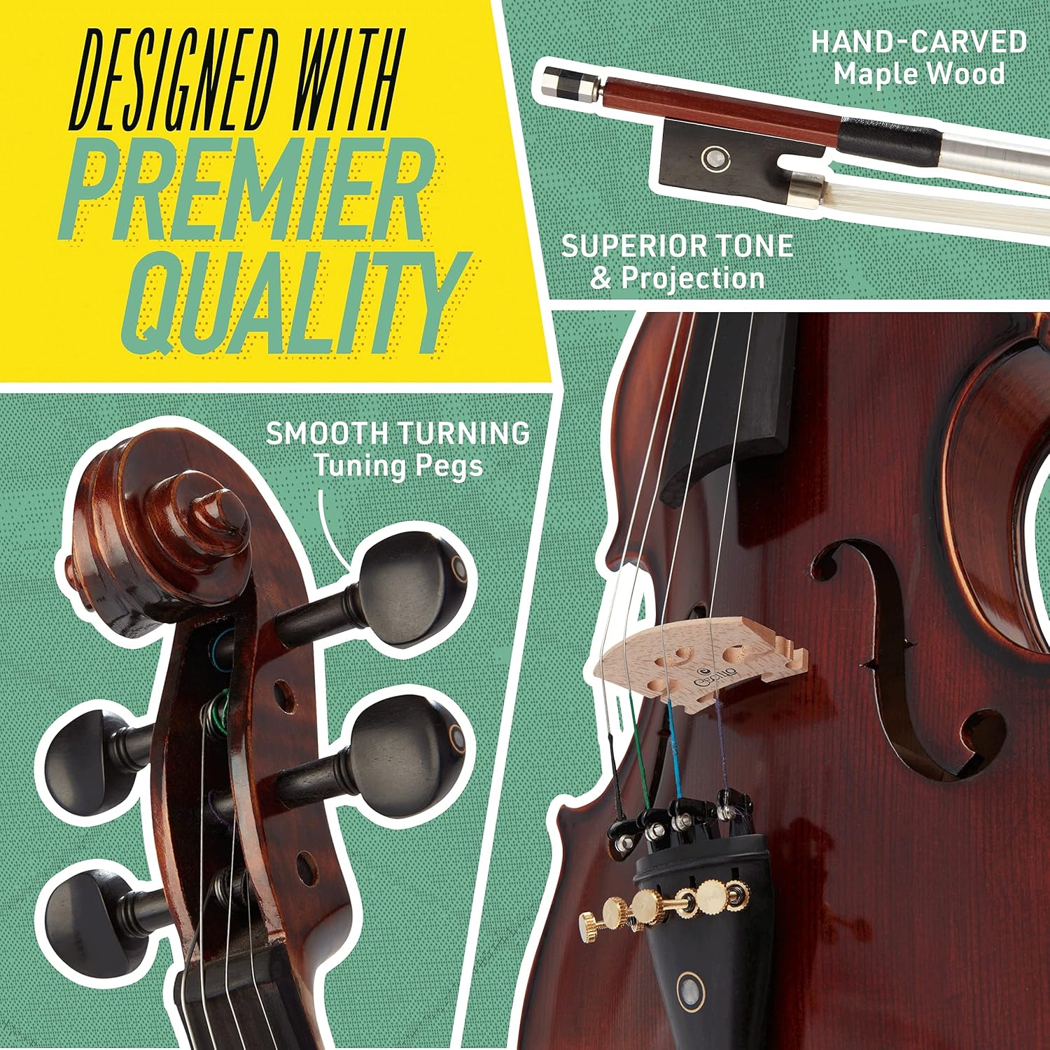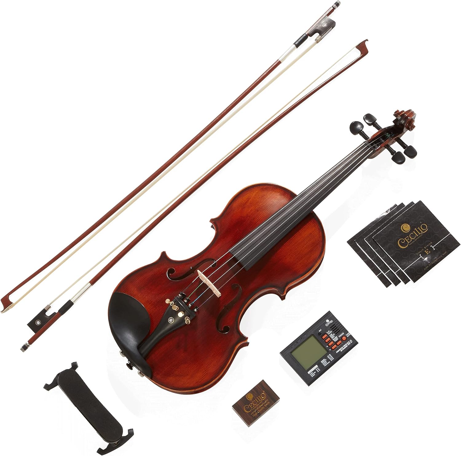 - Includes: tuner, hard case, two Brazilwood bows with unbleached genuine Mongolian horsehair, rosin, adjustable shoulder rest, two bridges, and an extra set of strings